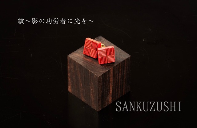【第22回 日本・フランス現代美術世界展 入選作品シリーズ】 『紋 〜影の功労者に光を〜 (SANKUZUSHI)』 漆芸(ピアス) 1.0×1.0×1.0 着物の柄の後ろや作品を引き立てる役回りの多い 「地紋」(じもん) だけど本当は、地紋だけを見ても素敵で素晴らしくとても美しいのだと それを伝えたくて、彼らに光を当てた作品を作りました サブタイトルである 『〜影の功労者に光を〜』 地紋のように 目立たない存在かもしれない 表舞台に出ていないかもしれないけれど 影で支えている人 見えないだけで輝いてる人 世界の片隅で頑張っている沢山の人たちに 「あなたは頑張ってる!」と そんな想いを伝えたくて名付けました 作品を通して 耳元から囁かなエールを贈りたい 正に今頑張っている方 頑張っているあなたの大切な方に想いが届きますように